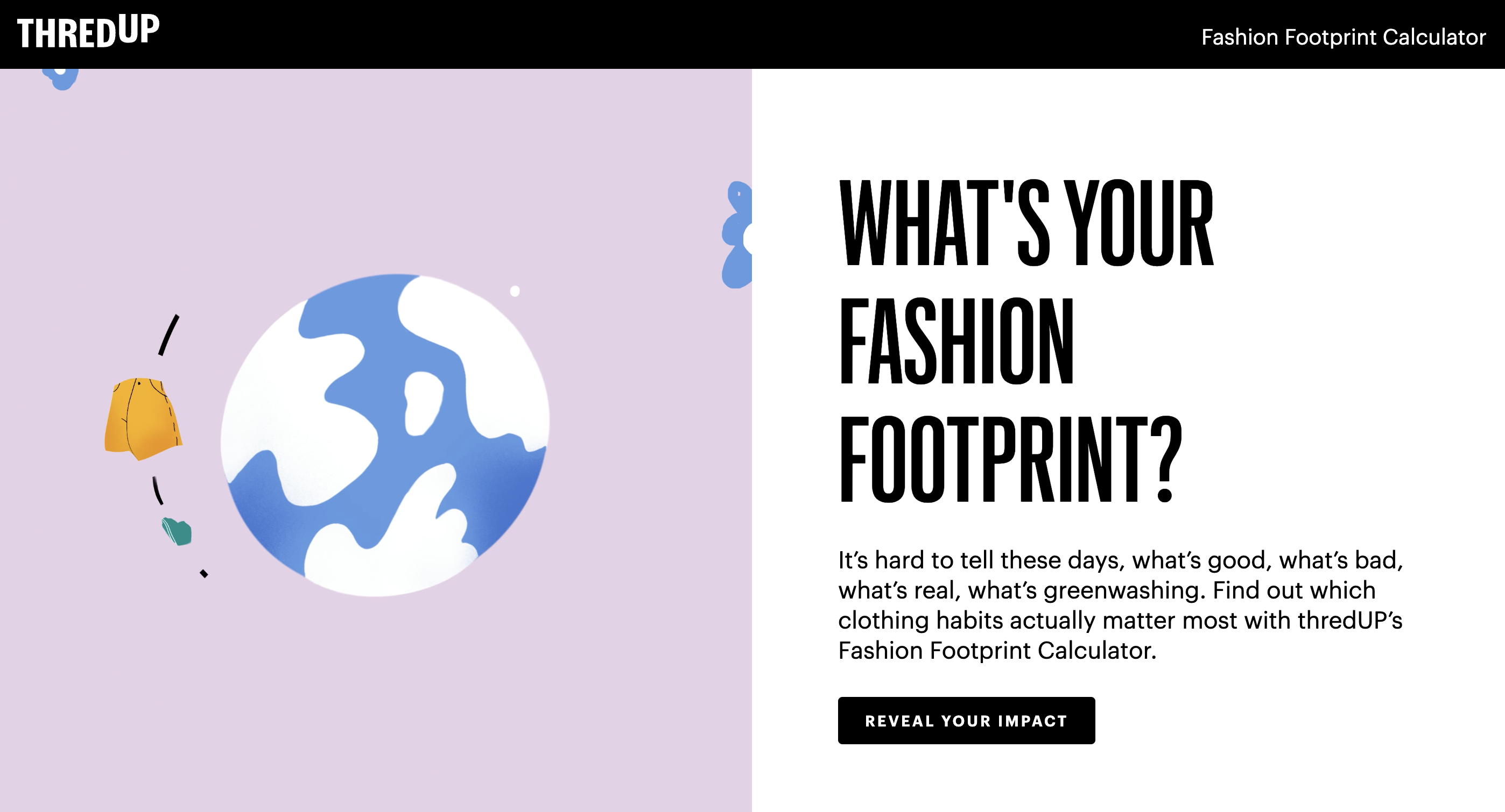 Next, ThredUp's Fashion Footprint Calculator. Fashion lovers, this one’s for you. Calculate your fashion footprint and discover more sustainable shopping practices. Wanna contribute to a cleaner planet? Swap a few shopping habits here! Not just shopping habits, but also how you do your laundry!